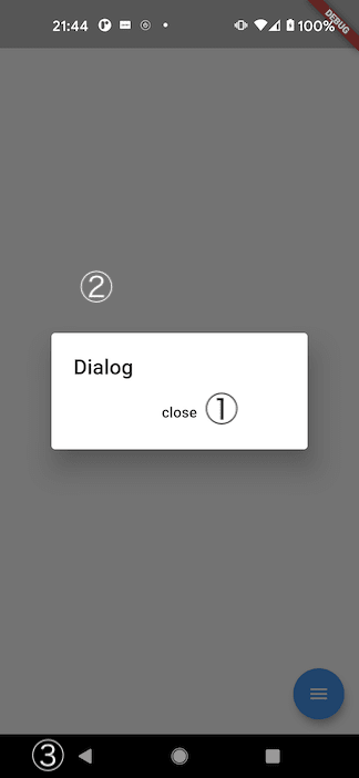 Dialogを閉じたい時は、基本的にDialog内の閉じるボタンを押下して、上記のNavigator.of(context).pop()を発火させることばかりだと思います。