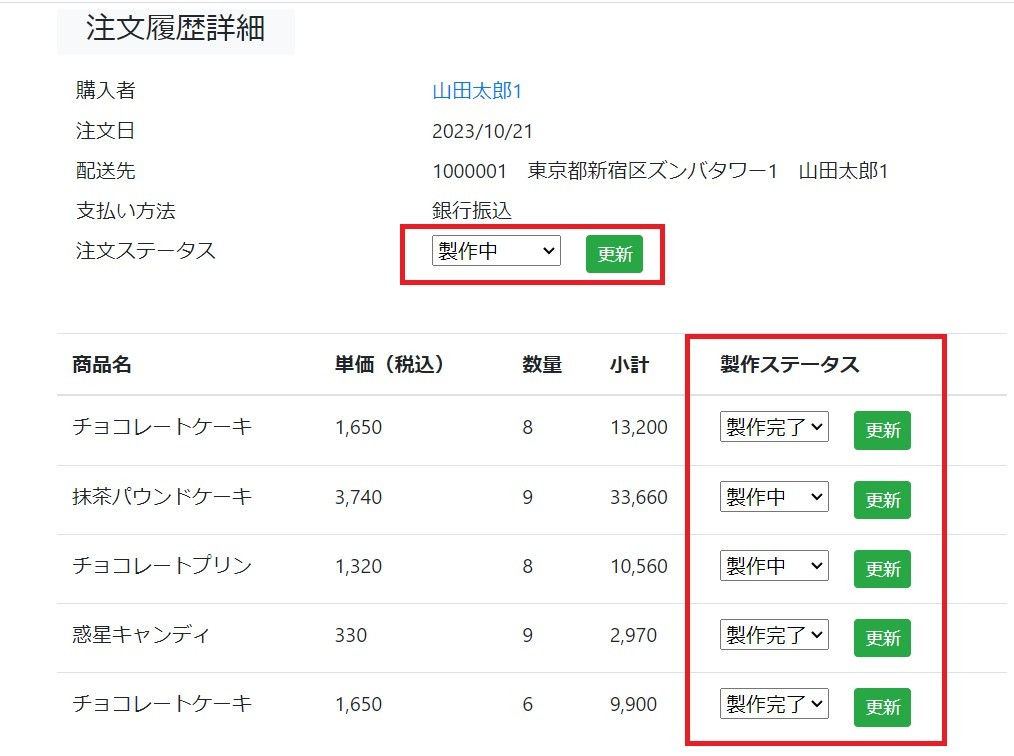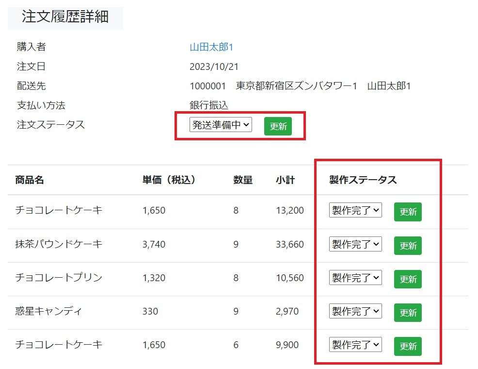 ②製作ステータスを全て「製作完了」にしたときに、注文ステータスが「発送準備中」に更新される
