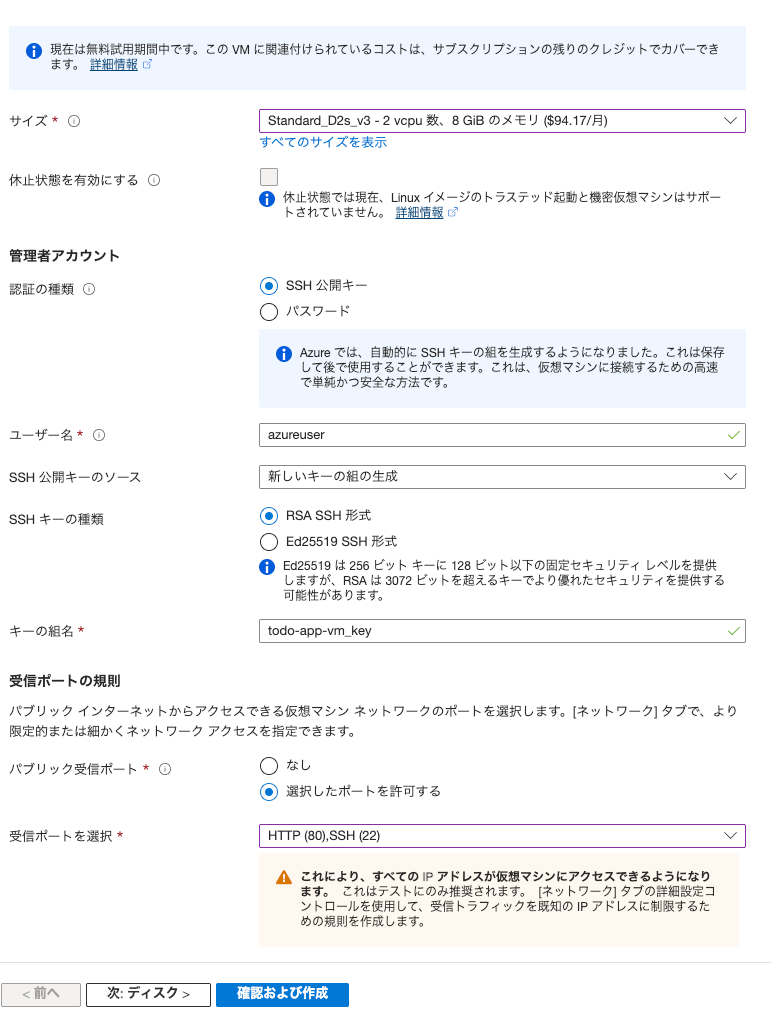 Standard B1sなど、最も安価なサイズで十分です。 - 認証の種類: セキュリティ上、SSH公開キーを選択します。