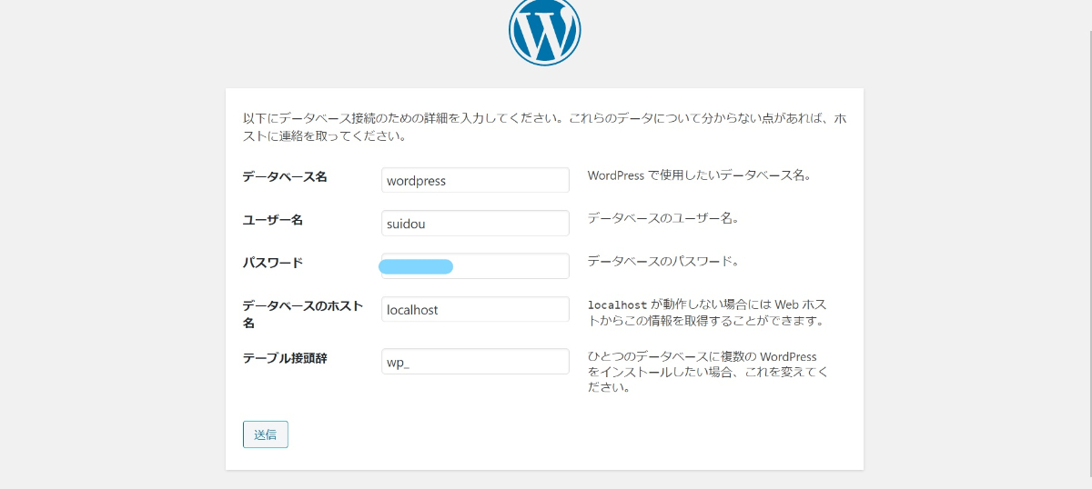パブリックIPアドレスを入力すると、WordPressのセットアップ画面に入る。