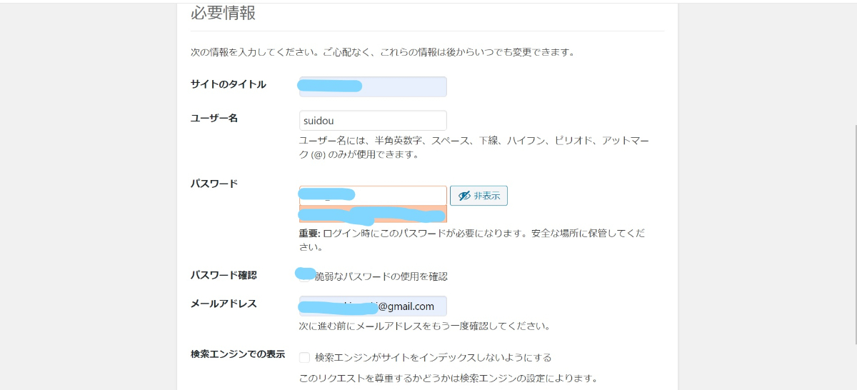 インストールできたらサイト名や管理者情報を設定する。