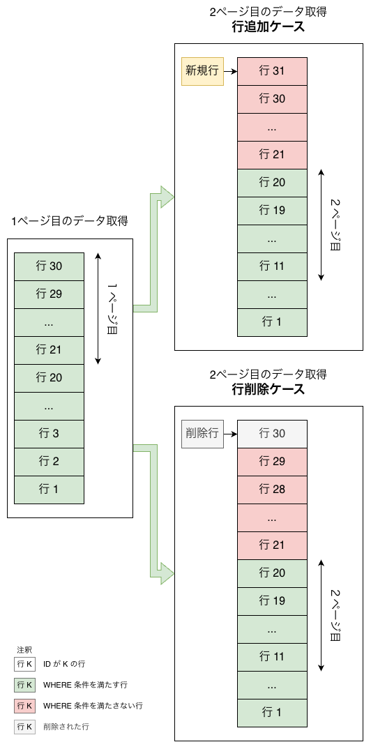図の例から分かるように、ページ遷移の直前に新しいレコードが追加されたり、既存のレコードが削除されたりしても、Page 2 に表示されるデータは 常に正確 で、重複も欠落もありません。