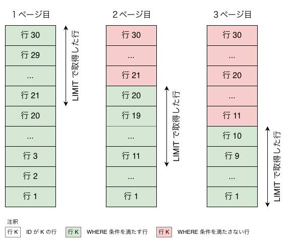 WHERE id < 21で前ページ末尾より古い行だけに絞り、LIMIT 10で次の10件を取得 - ページ3: 同様に