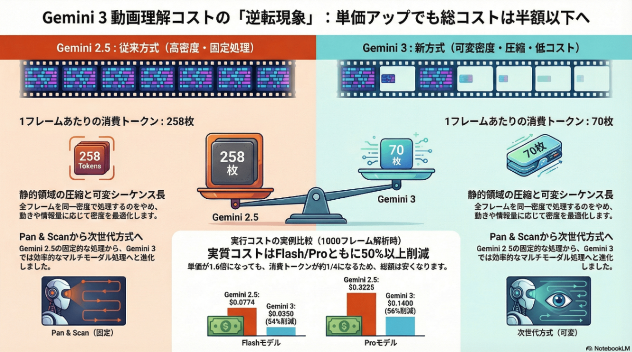 - 結果、動画理解の実行コストは Flash / Pro ともに半額以下