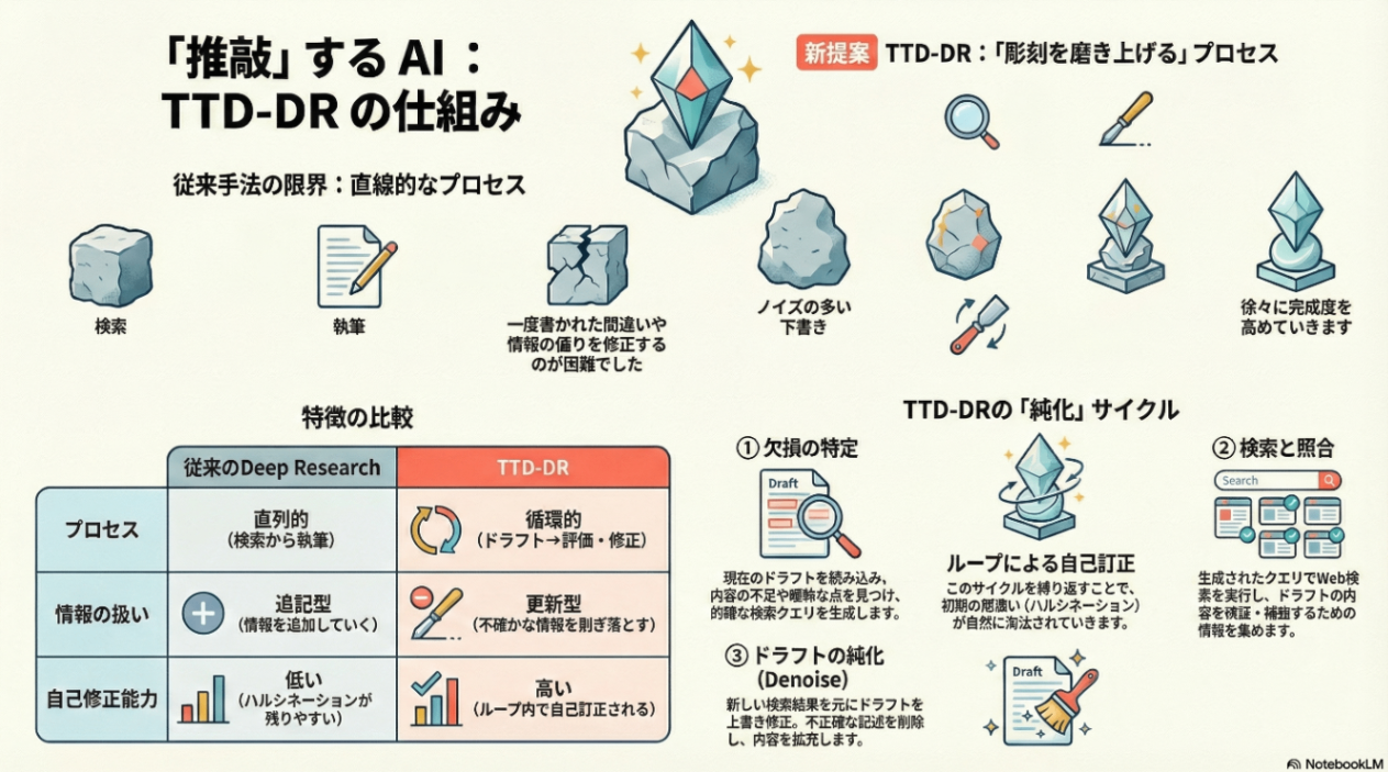 Test-Time Diffusion Deep Research (TTD-DR) は、LLM に「推敲」のプロセスを構造的に組み込むことで、長文リサーチの品質を劇的に向上させる可能性を秘めています。