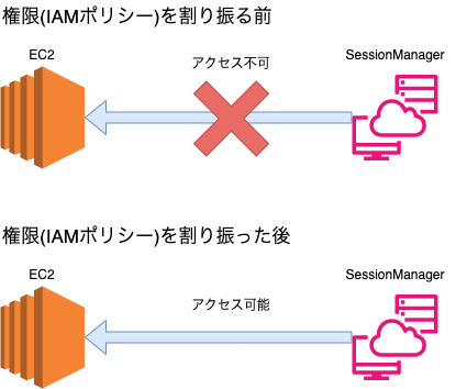 - 例えば、セッションマネージャーからEC2を操作できるようにするためにEC2にIAMロールを付与して権限を割振ります。
