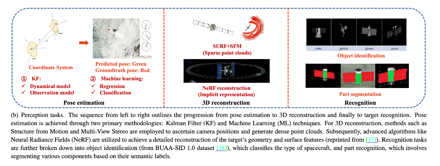 一口に宇宙の認識といっても、軌道上での観測を用いるものと地上観測を用いるものがあります。地上観測は大気や地理的な影響を受けるという短所を理由に、本論文では軌道上の観測にフォーカスします。 - 3つの認識タスク: 姿勢推定・3D再構築・識別