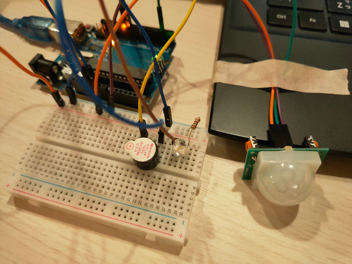 で、センサー自体は何か光ったり音が出たりしませんので、センサーがちゃんと反応しているかがわかりやすいよう、発光ダイオードとブザーも追加します。