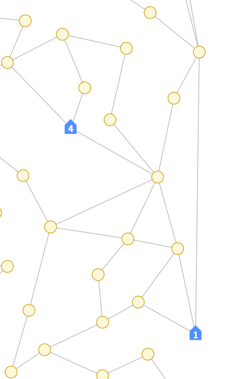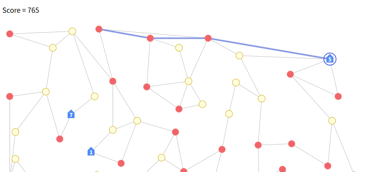 - 生成されるグラフが、ドロネー分割からさらに辺を枝刈りしたものになっている関係でノードの次数が控えめなうえ、ルール上Uターンが禁止されているのでルートの分岐が控えめ。