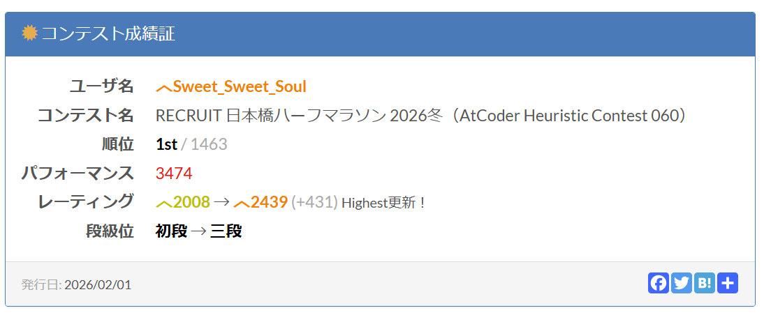 AHC060で1位を取れました。さすがに記念ということで参加レポと簡単な解法記録を残しておきます。