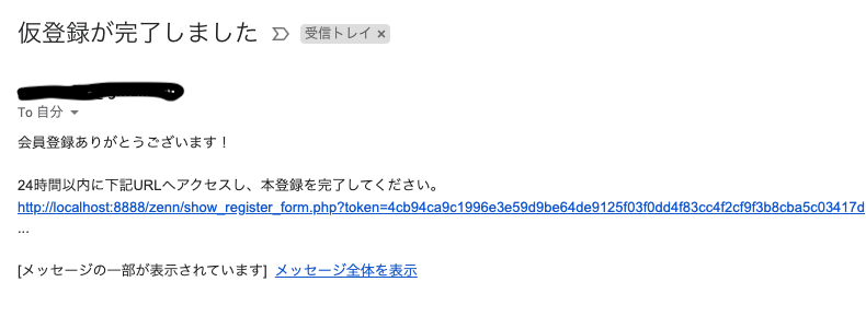 - 本登録用URLのクエリに上記で作成したトークンを持たせ、メールアドレスに送信し、送信完了画面を表示