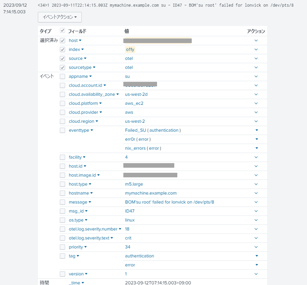 ※構造化データの中身もパースしていますが、これはSplunkが自動で行っていることで、syslog receiverとしてはstructured_data (map[exampleSDID@32473:map[eventID:1011 eventSource:Application iut:3]])の抽出まで。