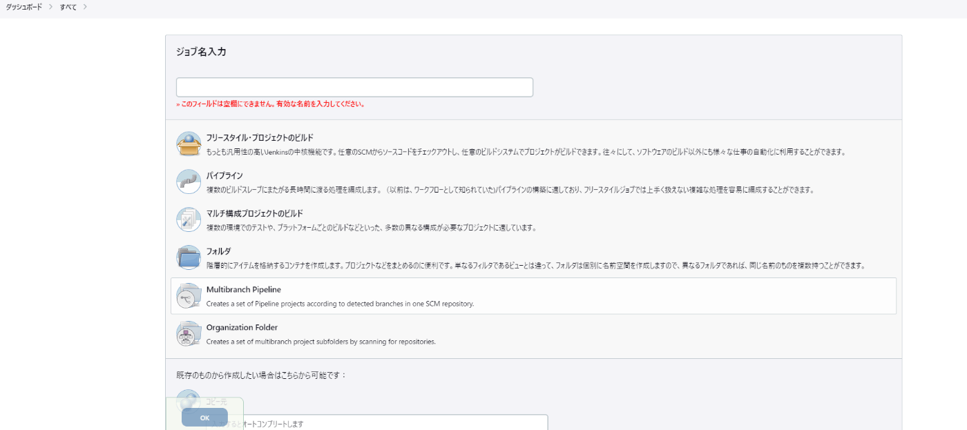 新規ジョブ作成からMultibranch Pipelineでジョブを作成する。