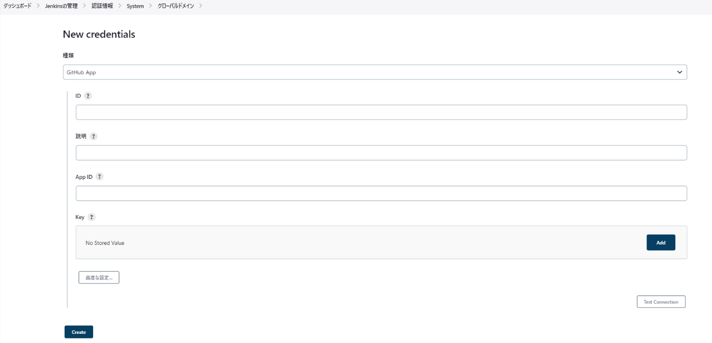 New credentialsでGitHub Appを選択し、以下のように埋める。