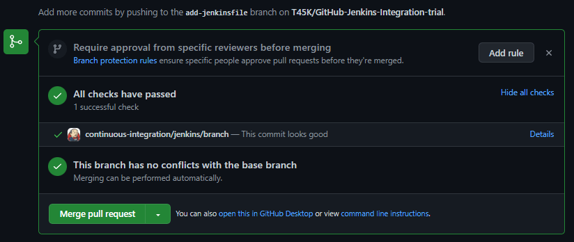 Gitリポジトリのルート直下にJenkinsfileを置いてpushすればCIが回るはず。成功するとChecksとして表示される。