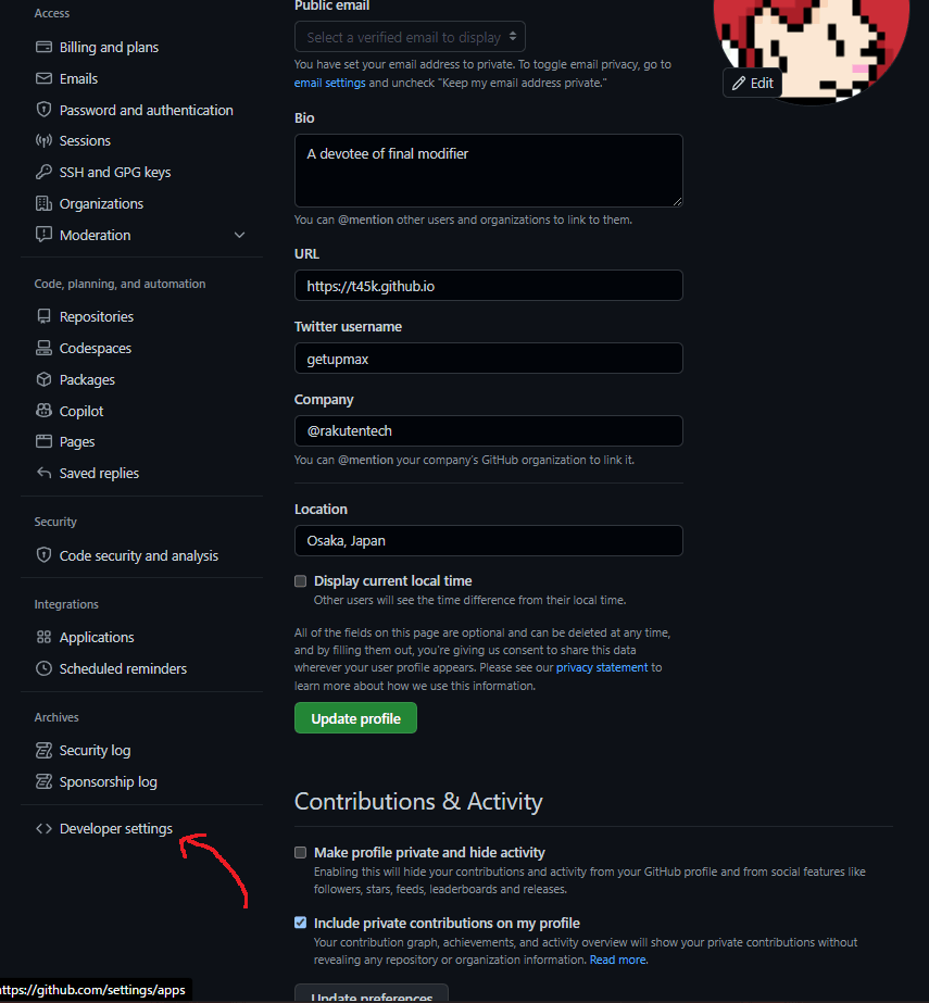 Settings > Developer settings > GitHub AppsからGitHub Appsのページに進む。
