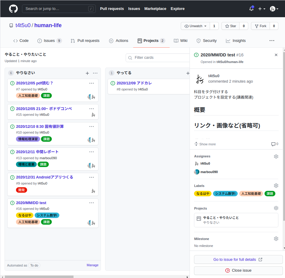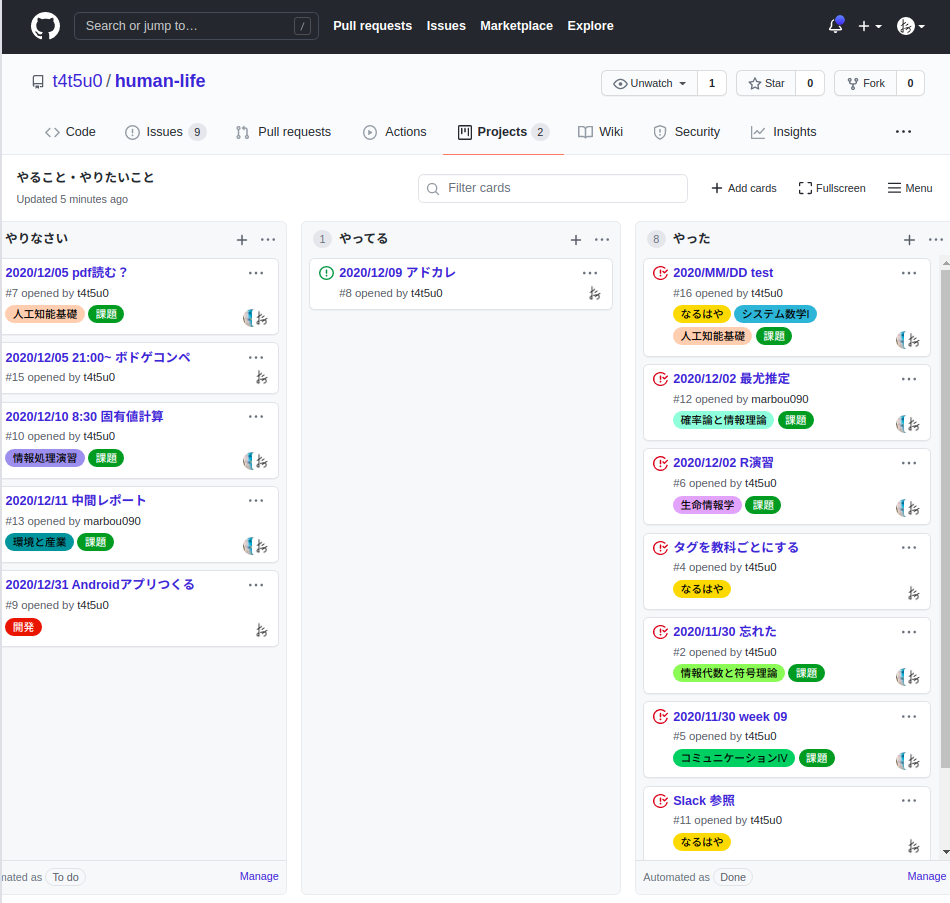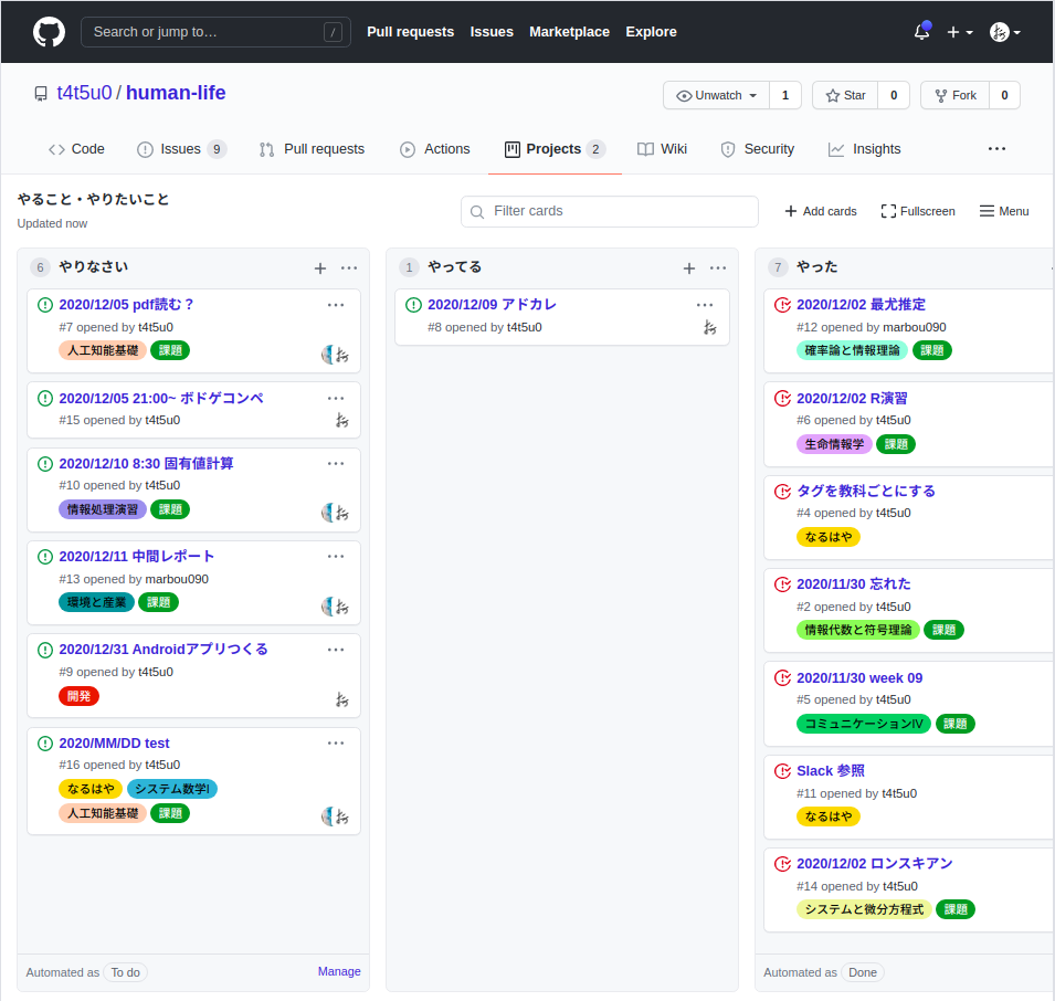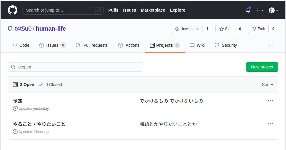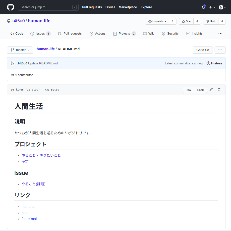 - [やること・やりたいこと](https://github.com/t4t5u0/human-life/projects/1)