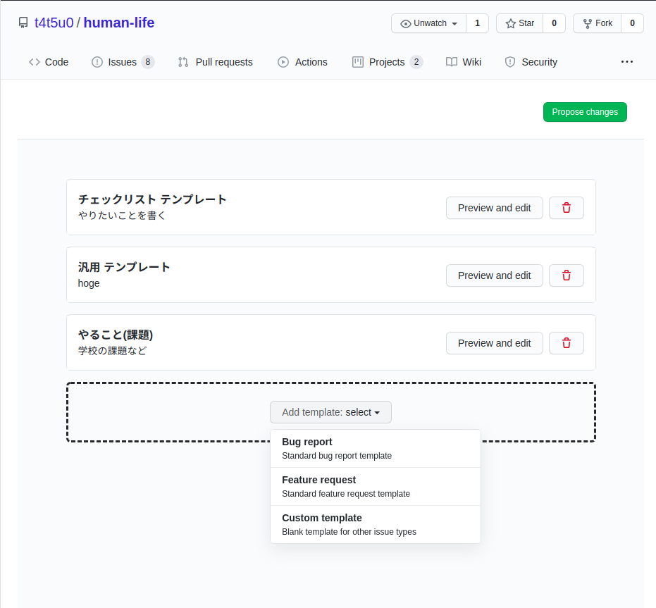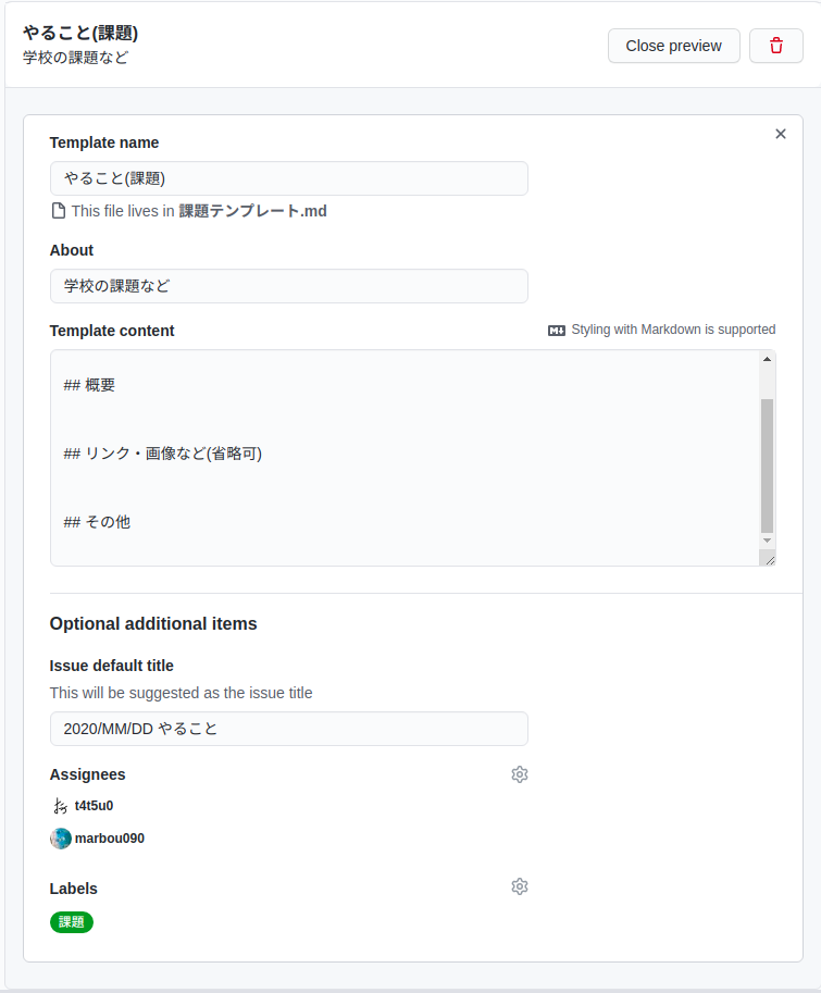 また,Issue Template を設定することで,Issue の設定を高速化,定型化しました.これをすることで,Issue を登録することがとても楽になります.
