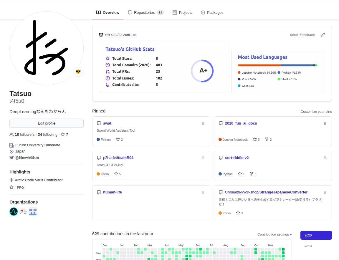 Pinnedという場所があります.ここに自分のリポジトリを6つまでピン止めできます.設定すると以下のようになります.human-life