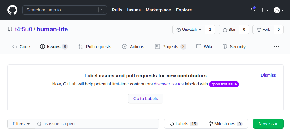 Issues のラベルを使いたかったので,リポジトリを新しく作ることにします.ラベルを設定することで,色による可視化,ラベルについての串刺し,入力の高速化などの効果が望めるからです.