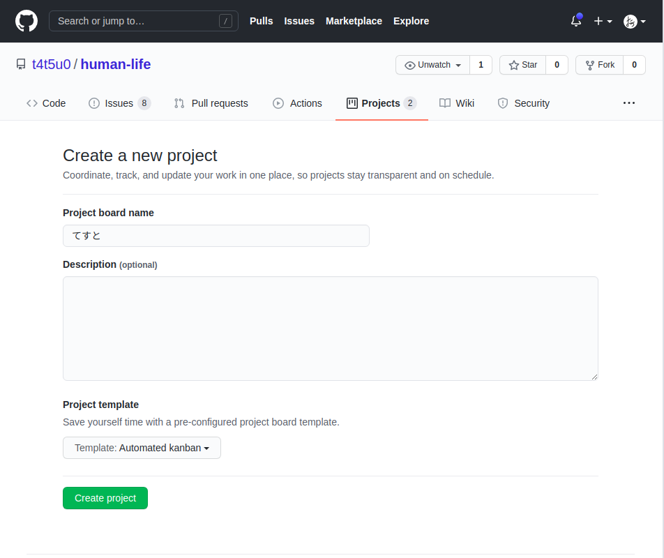 リポジトリを作ったら,Project を作ります.いくつ作っても構いませんが,見るコストがあがるのでなるべく少ないほうがいいと思います