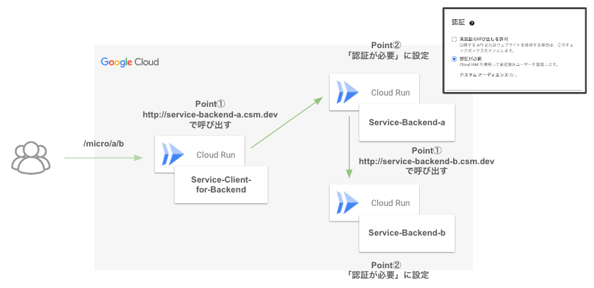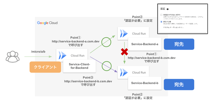 - Point①:Cloud Runサービスは、提供されているrun.app URLではなく、カスタマイズされたURLを使用して他のCloud Runサービスを呼び出すことが可能