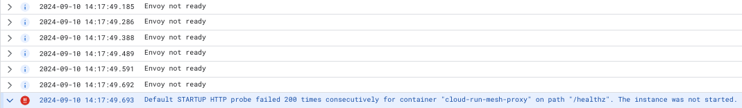 Cloud Logging を見てみると下図のように Envoy not ready が表示されており、最後には Default STARTUP HTTP probe failed 200 times consecutively for container "cloud-run-mesh-proxy" on path "/healthz". The instance was not started. と表示されました。