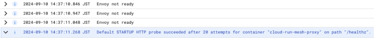 一方で、同様の設定値で gcloud コマンドから Cloud Run サービスを作成すると、下図のようにある程度時間が経つと Envoy が立ち上がっているように見えます。最後には Default STARTUP HTTP probe succeeded after 20 attempts for container "cloud-run-mesh-proxy" on path "/healthz". となり、正常な挙動となりました。