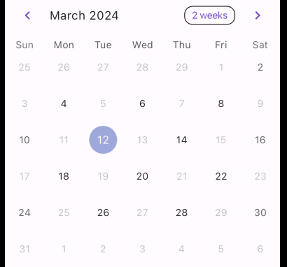 日付をタップしてもマークの位置は変わらない。また「2 weeks」ボタンをタップしてもカレンダーが2週間ごと表示にはならない。