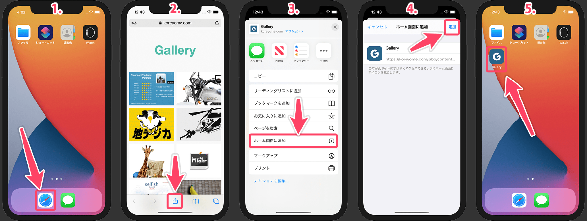 - 中央下の共有アイコンから「ホーム画面に追加」を選択