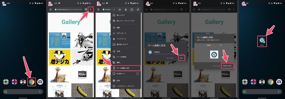 - 対象のWebサイトへブラウザ(Android-Chrome / iOS-Safari)でアクセスして「ホーム画面に追加」の操作を行う