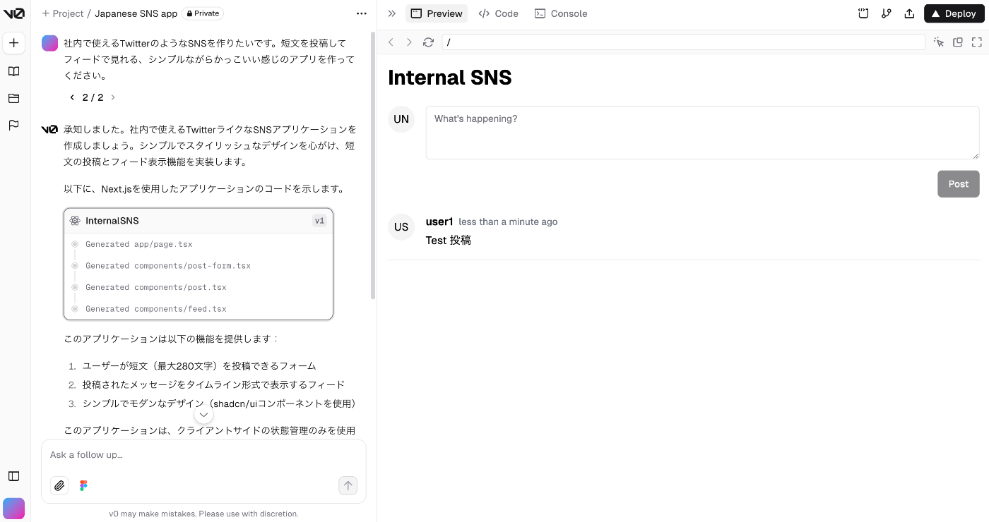 これ以降は、プロダクトをv0で作り、たまにSupabaseへマイグレし、デプロイを繰り返すだけです。 非常にカンタンにプロダクトを構築することが出来ます。