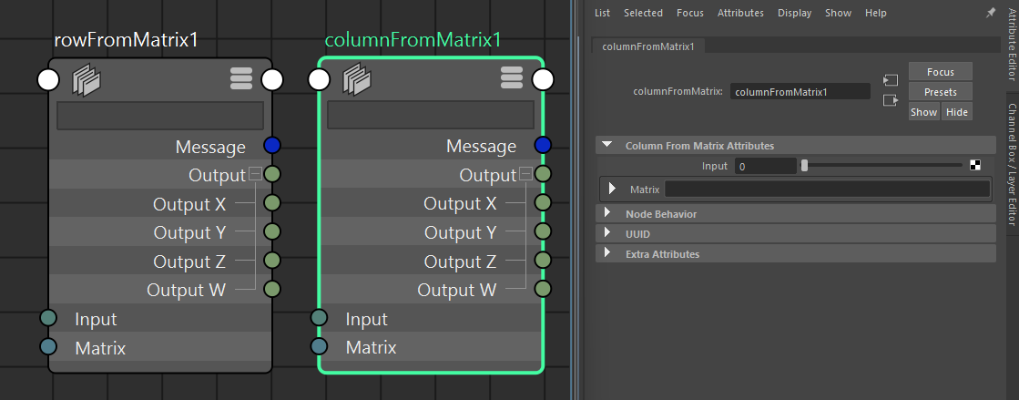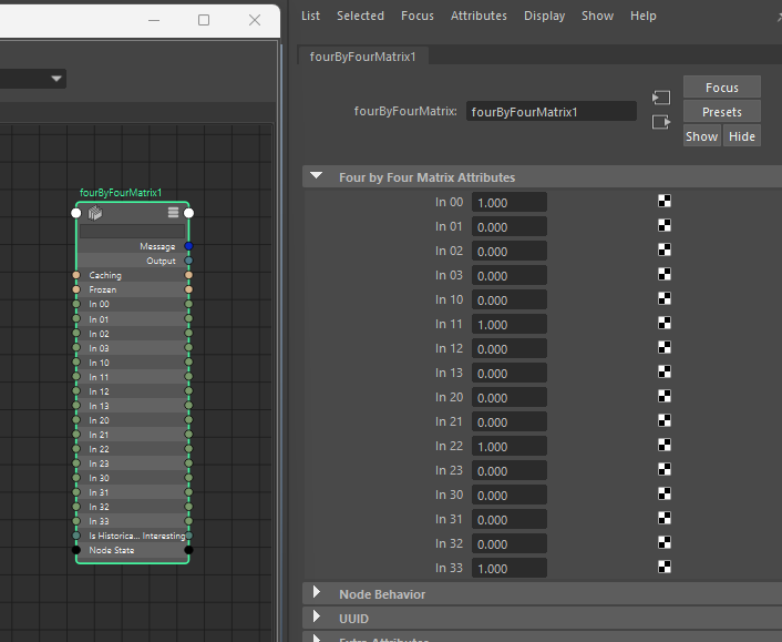 [fourByFourMatrix]を作成し、任意の数値を接続する。(ノードのアイコンの辺りで右クリック > Show All Attributesで入力アトリビュートを表示できる。)