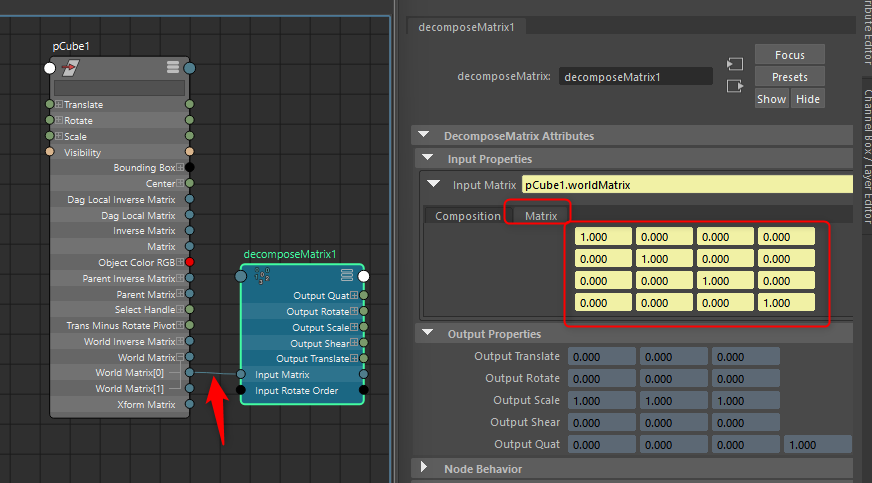 Attribute EditorでDecomposeMatrix Attributes > Input Properties > Input Matrix > Matrixを確認する。