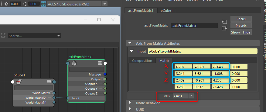 また、軸要素は[axisFromMatrix]で取得できる。例えばAxisアトリビュートをXにすると0行目のxyz成分が取得できる。これは、[rowFromMatrix]でindexを0にしたときに取得できるxyz成分の値と同じ。