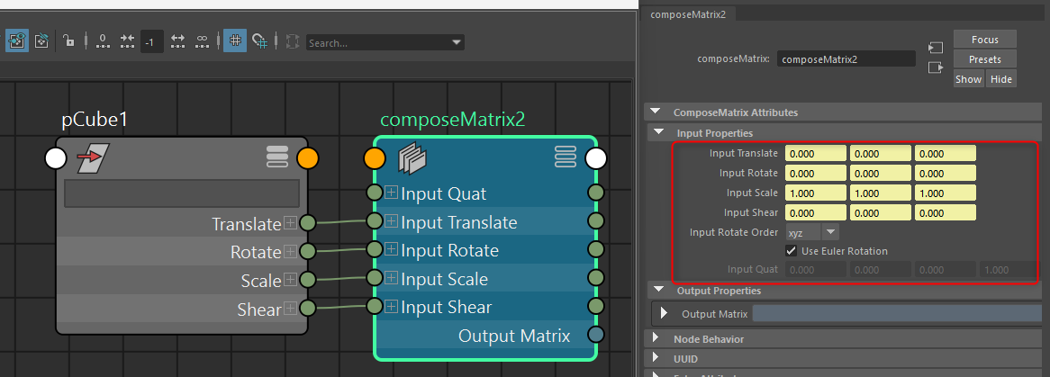 [composeMatrix]を作成し、TranslateやRotateを入力につなぐ。