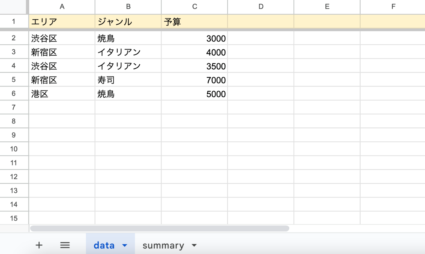 以下のサンプルデータを用いて、具体的な例を見てみます。このデータは、飲食店についてそのエリアとジャンル、予算をまとめたデータを想定したものです。