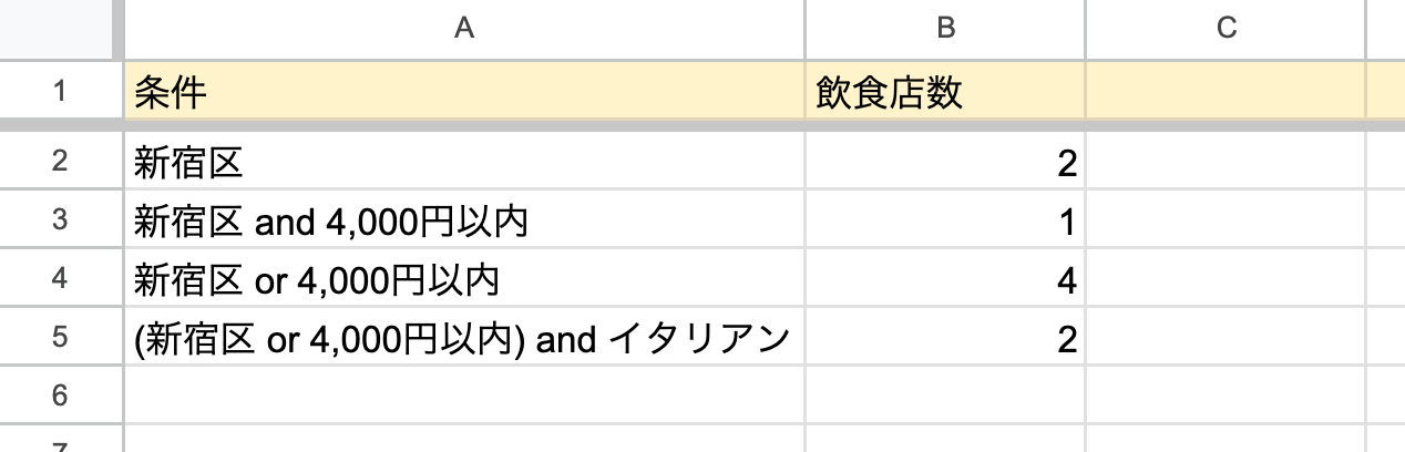 新宿区かつ予算が 4,000 円以内の飲食店をカウントしたい場合は、以下の式で求めることができます。