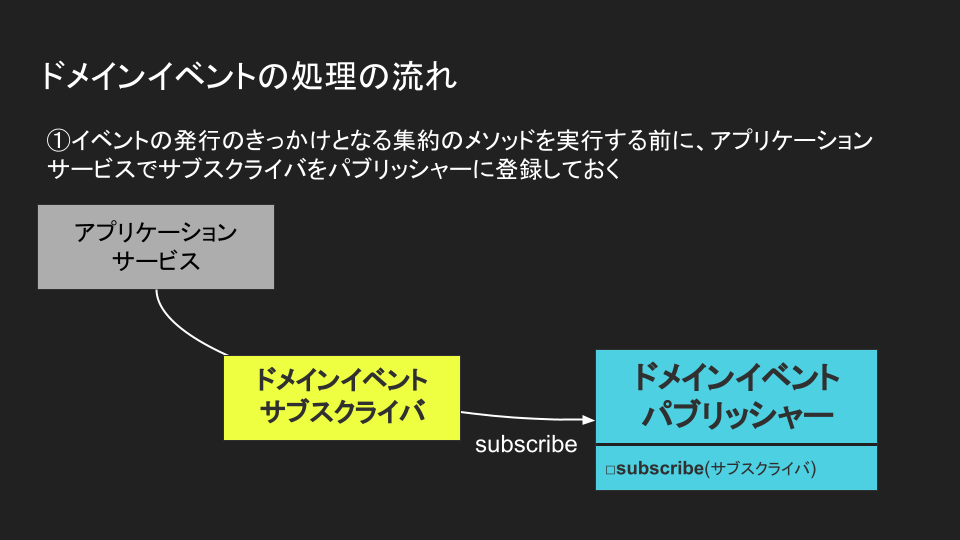 アプリケーションサービスからイベントの発行のきっかけとなる集約のメソッドを実行する前に、アプリケーションサービスでサブスクライバをパブリッシャーに登録しておきます。