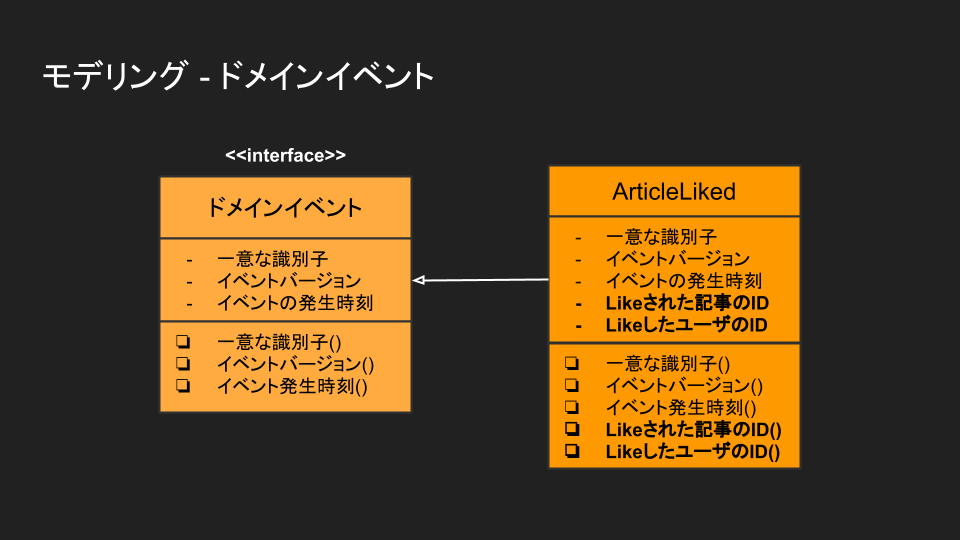 インターフェースのドメインイベントを実装し、実際のドメインイベント(上記の例でいうとArticleLiked)はそのインターフェースのドメインイベントを継承して実装する。