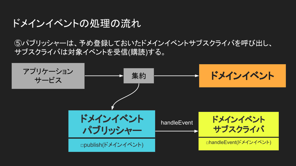 ドメインイベントパブリッシャーに発行されたら、発行されたそのドメインイベントを受信するサブスクライバに処理を委譲します。
