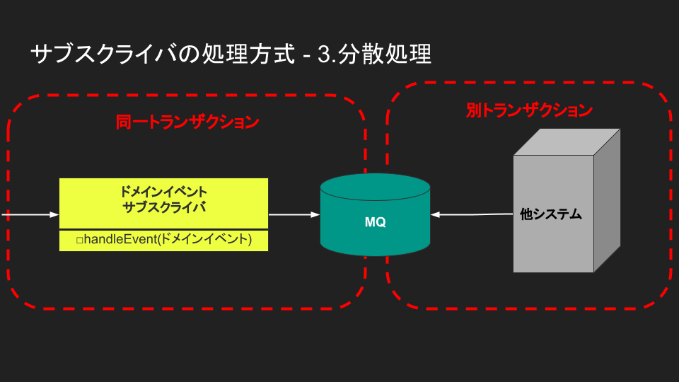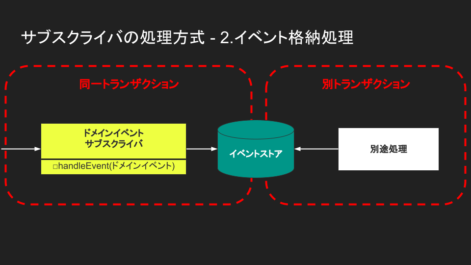 - 「1.同期処理方式」→実装されるドメインイベントごとに個別のサブスクライバを実装