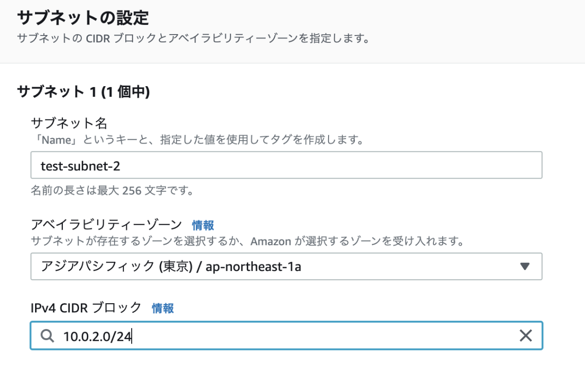 名前をtest-subnet-2としてIPv4 CIDR ブロックを以下のように設定する。