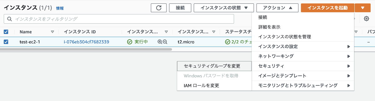 インスタンスを選択し、「アクション」→「セキュリティ」→「セキュリティグループの変更」をクリックする。
