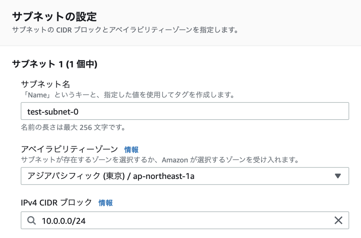 名前をtest-subnet-0としてIPv4 CIDR ブロックを以下のように設定する。