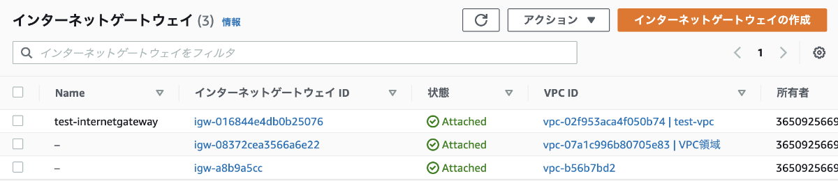 ※作成してすぐは、どこにもアタッチされていないので、作成したインターネットゲートウェイを選択し、「アクション」→「VPCにアタッチ」より作成したVPCにアタッチする。成功すると、以下のように状態が「Attached」になる。