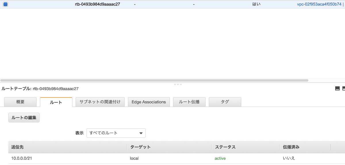 このIPアドレスは全てと言う意味があり、「デフォルトルート」と呼ばれる。流れとしては、デフォルトでは、ターゲットがインターネットゲートウェイになるが、VPC内部のIPアドレスのみターゲットがローカルになる。