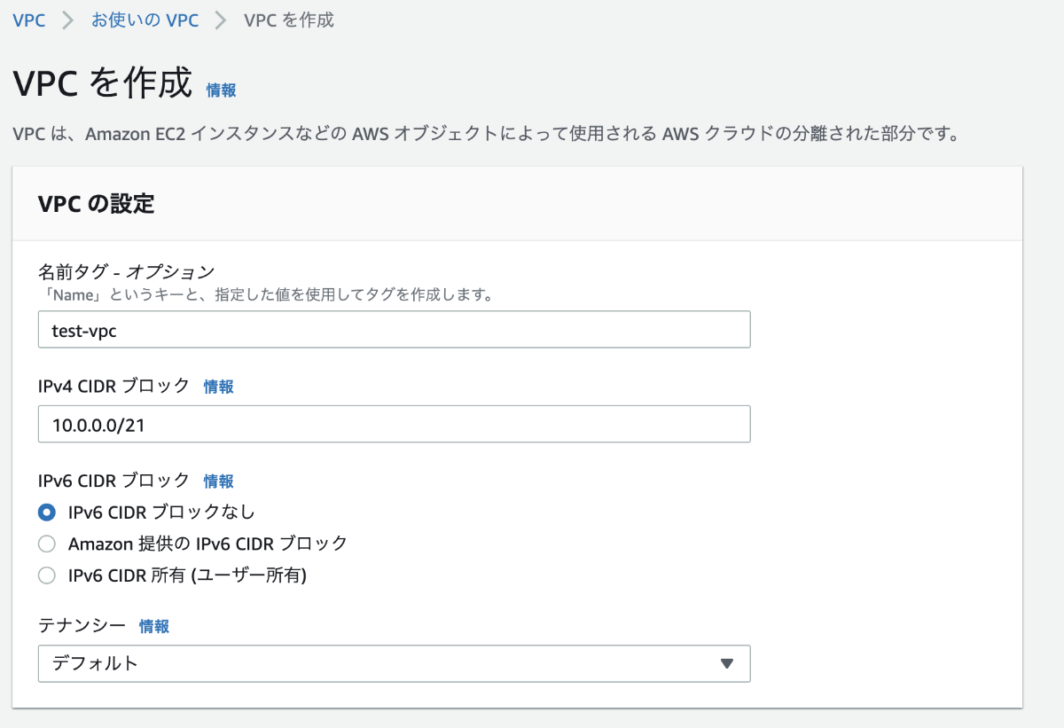 名前をtest-vpcとしてIPv4 CIDR ブロックを以下のように設定する。