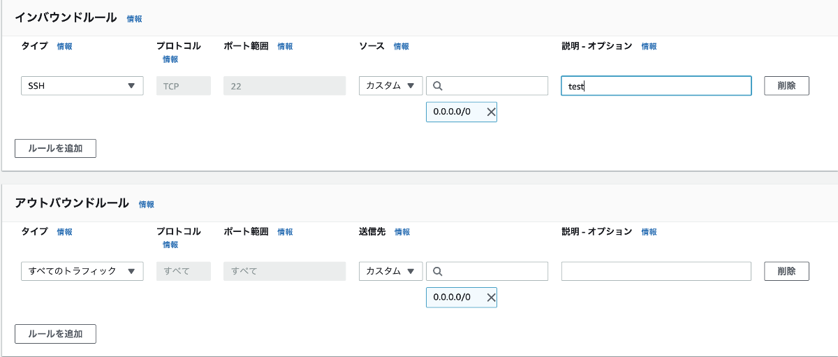 今回はSSHログインすることが目的なので、SSHのインバウンドを全てに設定する。