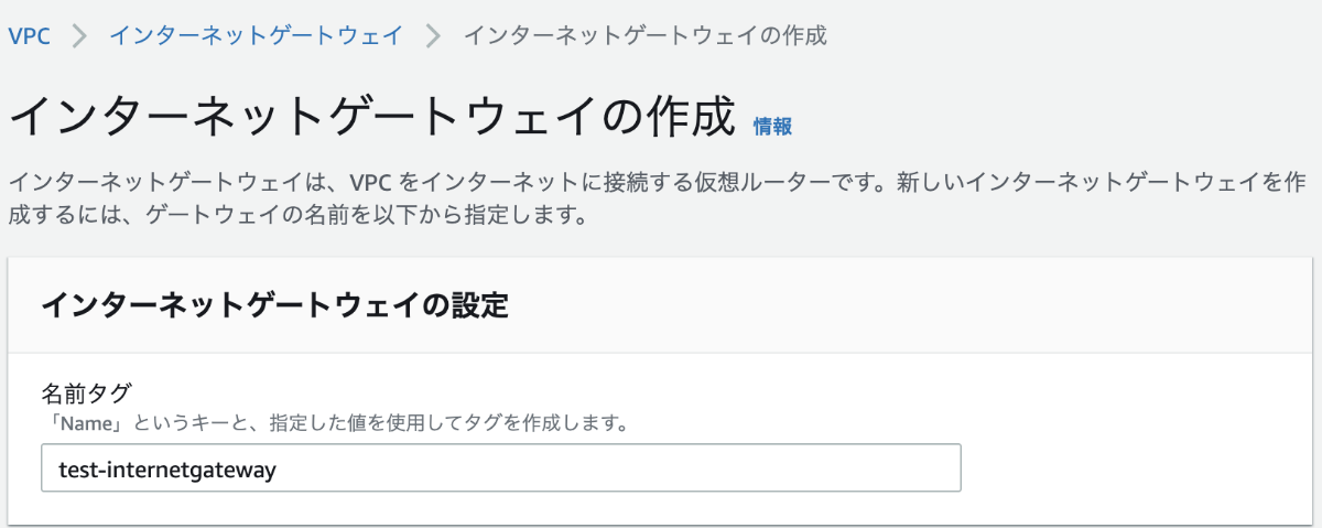 名前をtest-internetgatewayとして作成する。